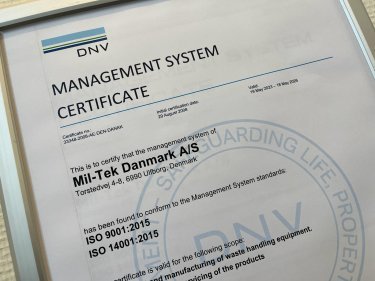 Mil-tek A/S is dedicated to delivering products that meet the highest standards of quality, safety, and environmental responsibility — in line with both customer expectations and legal requirements. Our certified management system ensures full compliance with DS/EN ISO 9001* and DS/EN ISO 14001, reinforcing our ongoing commitment to excellence.